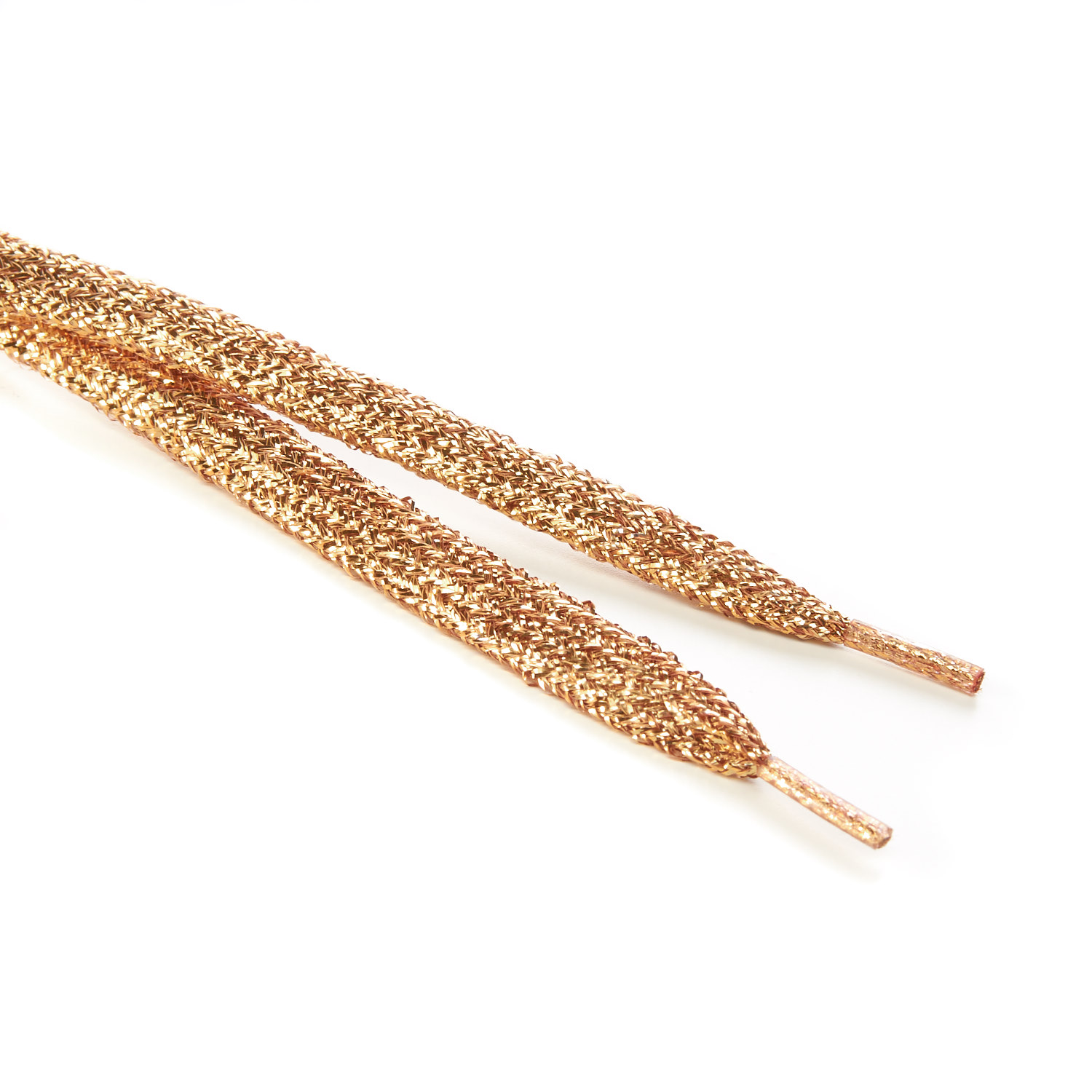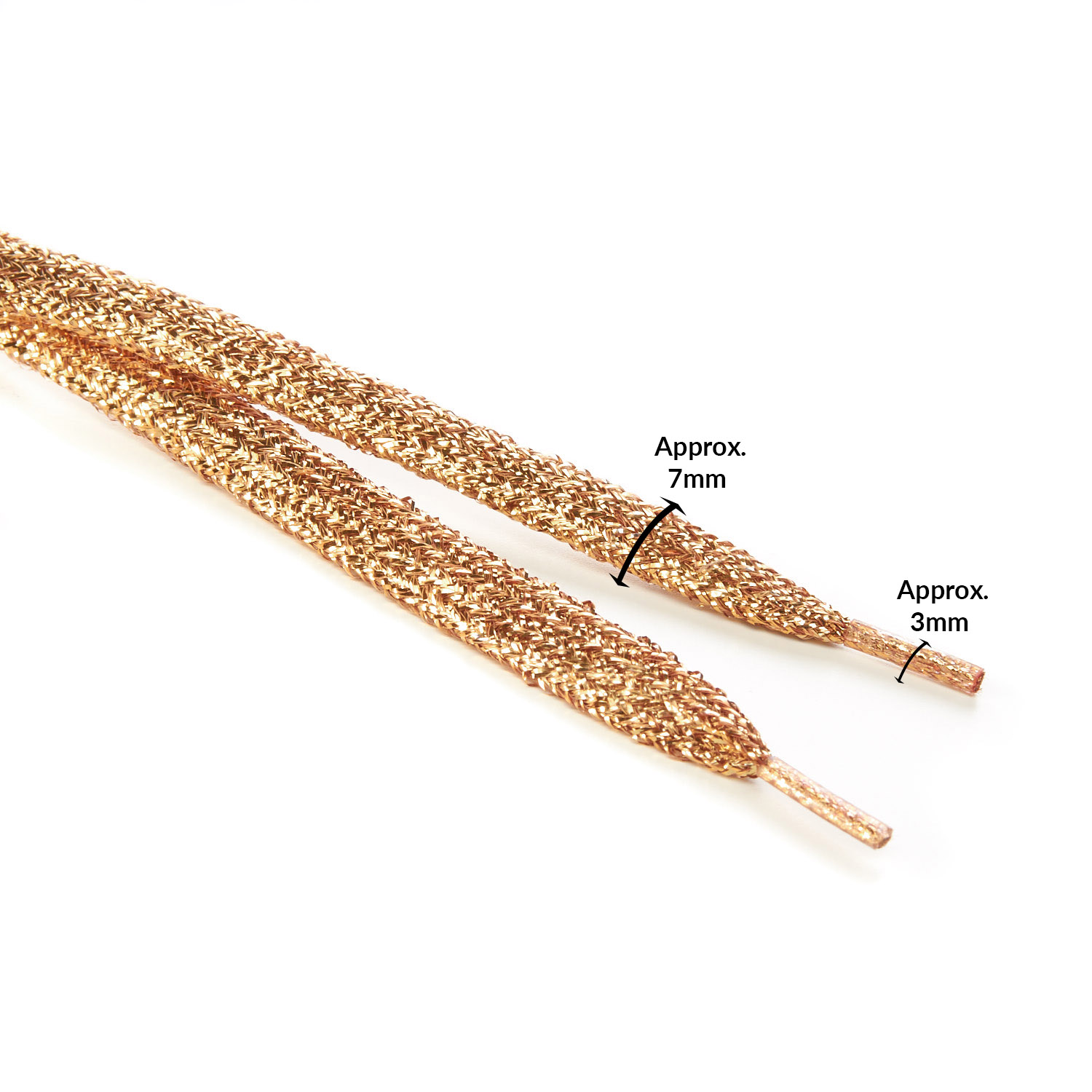 Our Flat Tubular Metallic Lurex Shoe Laces are approximately 7mm wide and come in gold and silver tones, with other colors available on request. Additionally, we can manufacture laces to any length or width to match your specific footwear or brand requirements. Consequently, these options allow businesses to provide laces that perfectly complement sneakers, casual shoes, boots, or fashion footwear.
