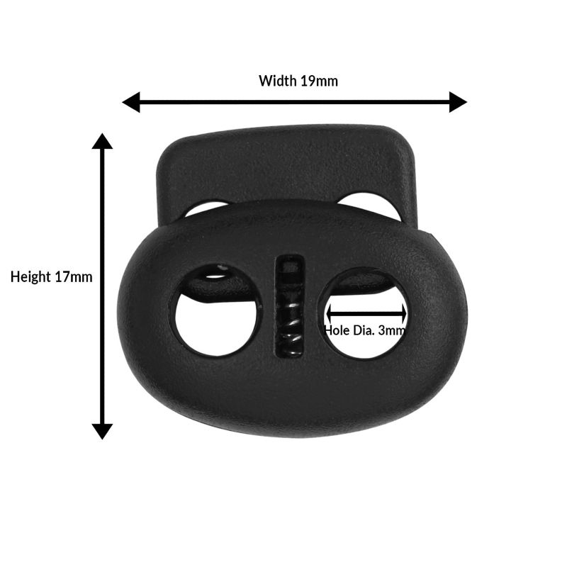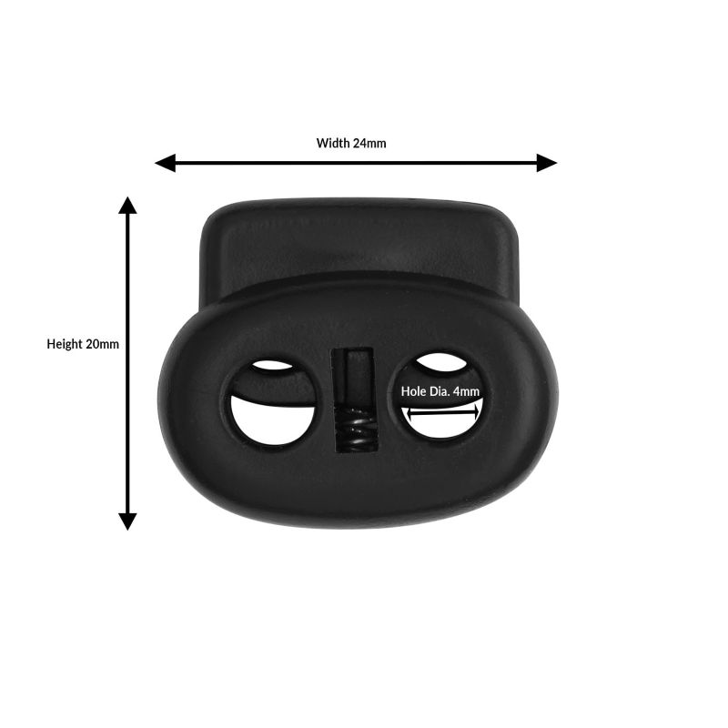The Plastic Pig Nose Toggle 2 Hole Cord Lock is a lightweight, double-hole spring-loaded fastener designed for 2mm–3mm shock cords, drawstrings, and bungee cords. Available in small and large sizes, it is ideal for garment manufacturers, DIY projects, and commercial applications that require secure and adjustable cord fastening.